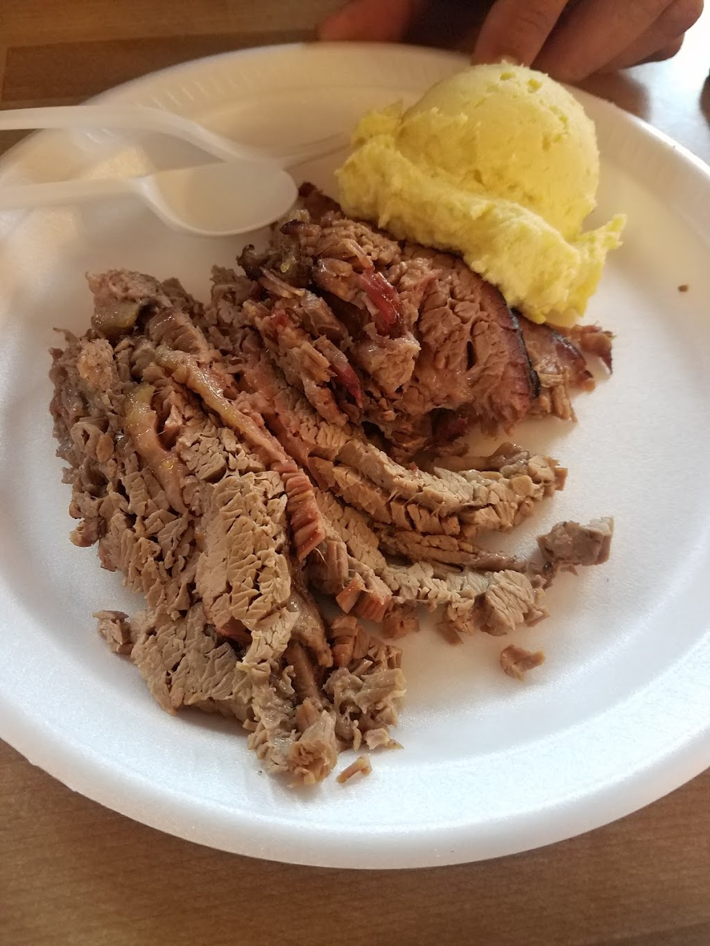 This is my first time trying this place out, my first impression the cleanliness of the place, thumbs up on that. Second, spacious with plenty of tables to dine in and friendly staff. My choice of food brisket and sausage, with a side of beans and potato salad. The brisket is not the best but not bad as well as the sausage, bbq sauce adds a good kick to the meats. The beans are good as well as the potato salad. Good place to eat.