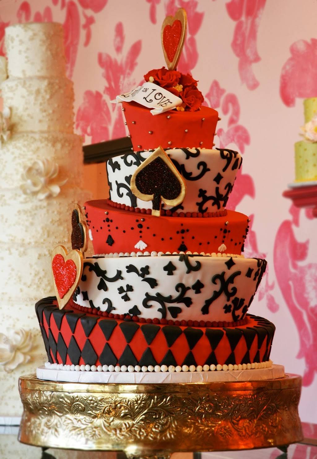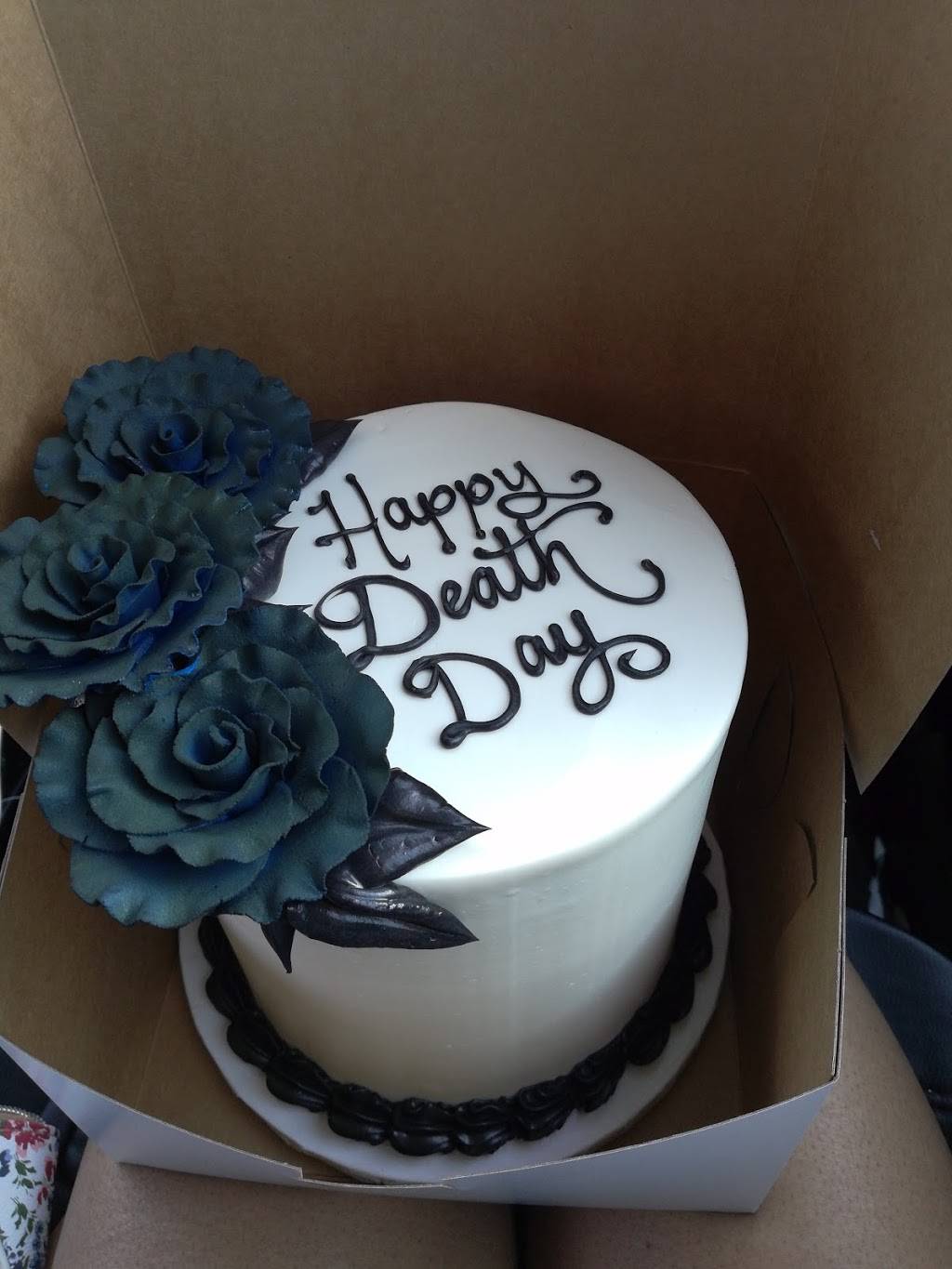 This cake was BEAUTIFUL. They did exactly what I asked. I asked for a white cake with black roses on it and to say Happy death day. I also asked that the cake be tall and the inside to be black. When I told them on phone I wanted the cake to be dyed black they said that the dye would change the flavor or something like that. Here's the thing, I've ordered colored cakes before and the taste wasn't thrown off by that much. The cake was also still perfectly yummy when I buy other colored cakes. Plenty of bakeries dye cakes all the time and there cakes still taste wonderful. This bakery however, they SOAKED the cake in dye. All I tasted was dye. The cake was wet and nasty. When they baked the cake if they knew it was like this then they should have called or something. The cake was TERRIBLE. No one ate it even though it looked so amazing!! These people know how to decorate fancy and elegant. There baking not so much. I think they weren't sure how much dye to add so that it would take and so they decided to just throw in the whole bottle just to be sure. Don't buy a cake just for its looks if no one is going to eat it. Cost $75 I think