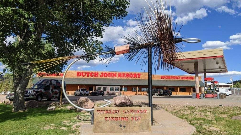 Pretty cool roadside attraction, if you enjoy these types of things. Do you remember the days when roads zigzaged across the country, cars got crappy gas mileage so people had to stop more often, there were service stations and rock shops, fresh fudge and roadside attractions. Like the world's largest ball of twine, or the upside down Cadillacs, this is neat, the World's largest fly fishing fly, located at the famous Dutch John resort here in Dutch John Utah. Stop by and visit our roads still zigzag.