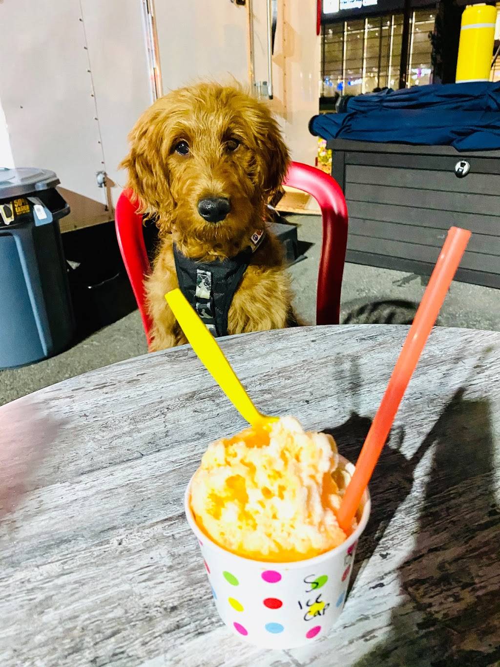 This place is awesome! Great flavors and great atmosphere! They have a ton of great flavor options to choose from and of course you can make your own! I went with half tiger's blood and half mango with ice cream in the center and condensed milk on top. It was amazing. You should go there and try it out, you won't be disappointed! Also, they don't skimp you on the flavors which is something that bothers me about other shaved ice places. Additionally, the customer service was great! It's family owned and operated and they couldn't be nicer. As you can see in the pictures that there's plenty of places to sit and all of the tables are very clean. They also play some good music and have misters going to cool you down.Overall, I am very pleased with my experience there and will be going back this weekend for a second helping!