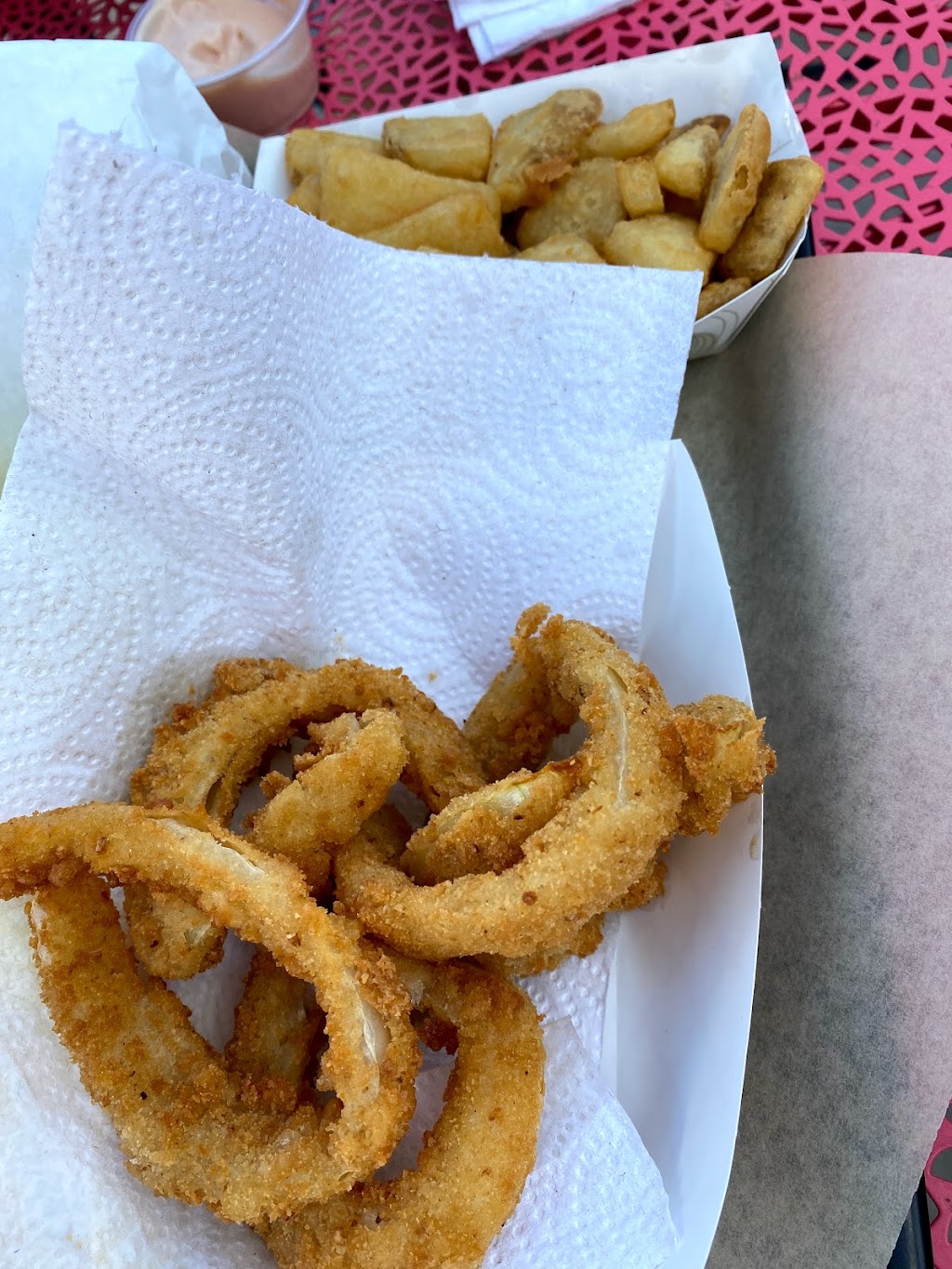 Cute place, friendly staff. We ordered the fish was told it was “cod” received our order and batter surrounding fish was not cooked all the way through 🤨 fries were ok should have ordered the cheeseburgers they looked way more appetizing