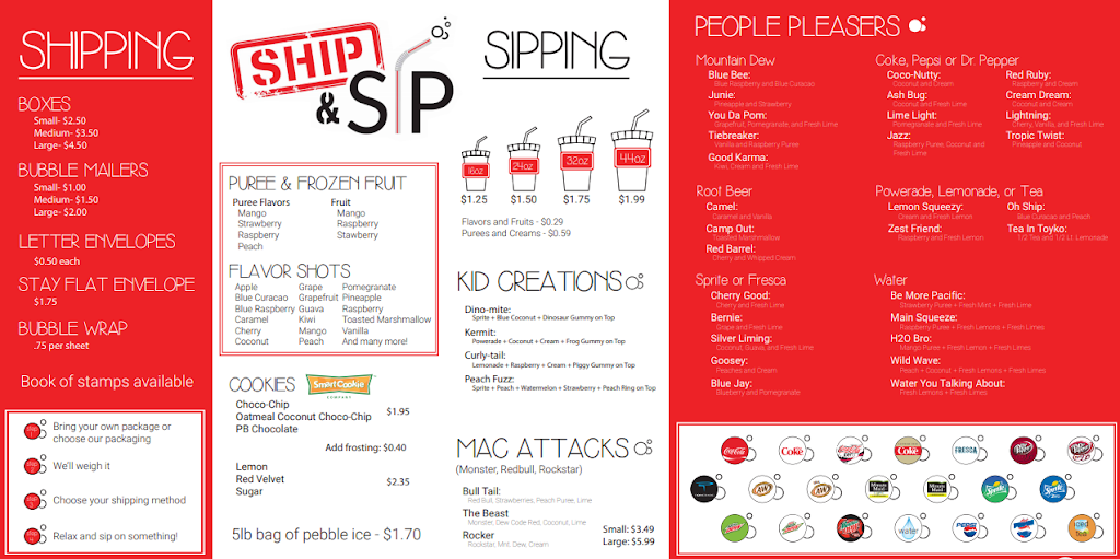Call me biased, but I love this place. Do you have an amazon return (or stack of returns) sitting at home? Grab it, pull up to the window at Ship & Sip, hand it to the employee who can then take care of the rest. Need to ship something to your relative? Don’t stand in line at the post office, just go through the drive-thru here and let Ship & Sip shop postage rates for you between USPS, FedEx, and DHL. Get the best rate, all while sitting in your car listening to your favorite music. Oh wait, you’re hungry? Grab a ham & cheese croissant. Sweet tooth? Choose from a variety of the delicious cookies made by Smart Cookie. Thirsty? Get the best mixed soda you’ve ever tasted. Cannot praise this ingenious idea enough! So convenient, so much faster than the post office, and such a more pleasant experience overall.