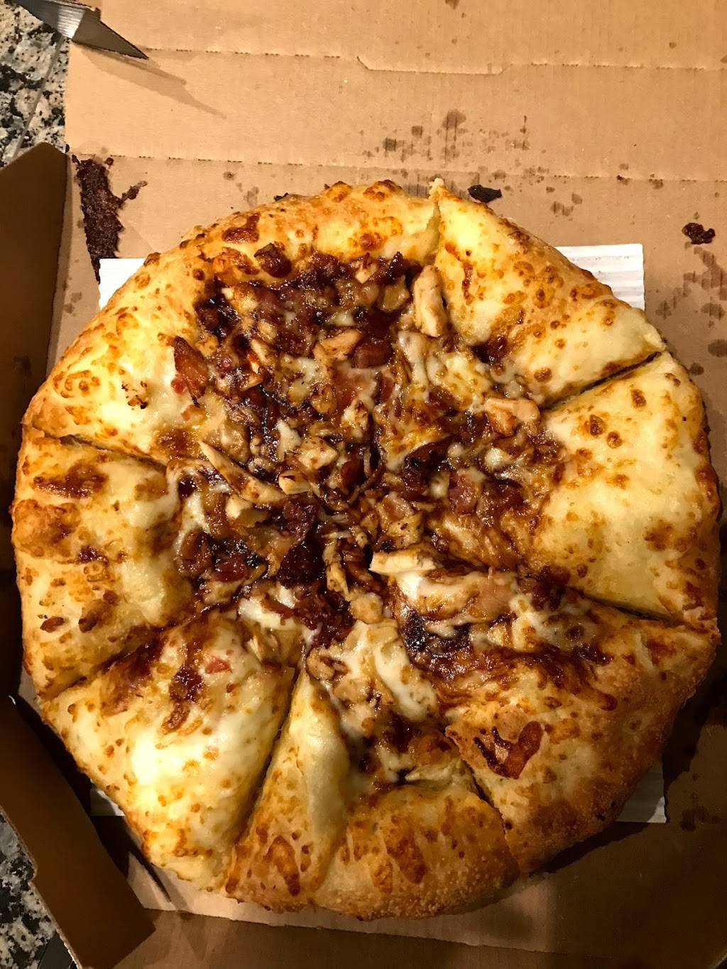 Ordered online, they had it ready pretty quick. Only giving 3 stars because I was kind of sad that the parmesan bread bites had way too much garlic butter stuff. There was like a pool of it and the bites were mushy and it was disappointing. The location is fine to get to, but can be tricky when trying to leave if you're turning left. The pizza was really good, and so was their alfredo chicken pasta.