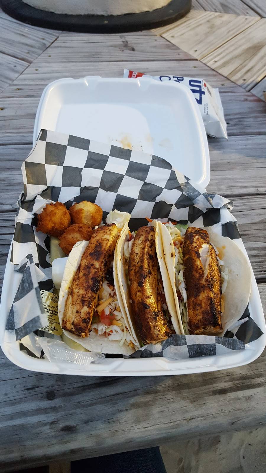 Best crab cakes I’ve ever had! We stopped by around noon, it wasn’t very busy. You are handed a menu and can make your order at the counter. While we waited for our food, we sat outside at a picnic table on the sand, it was very relaxing. The crab bites were perfect! I couldn’t taste any breading or filler ingredients, just crab and seasoning, hot and lightly crisped.