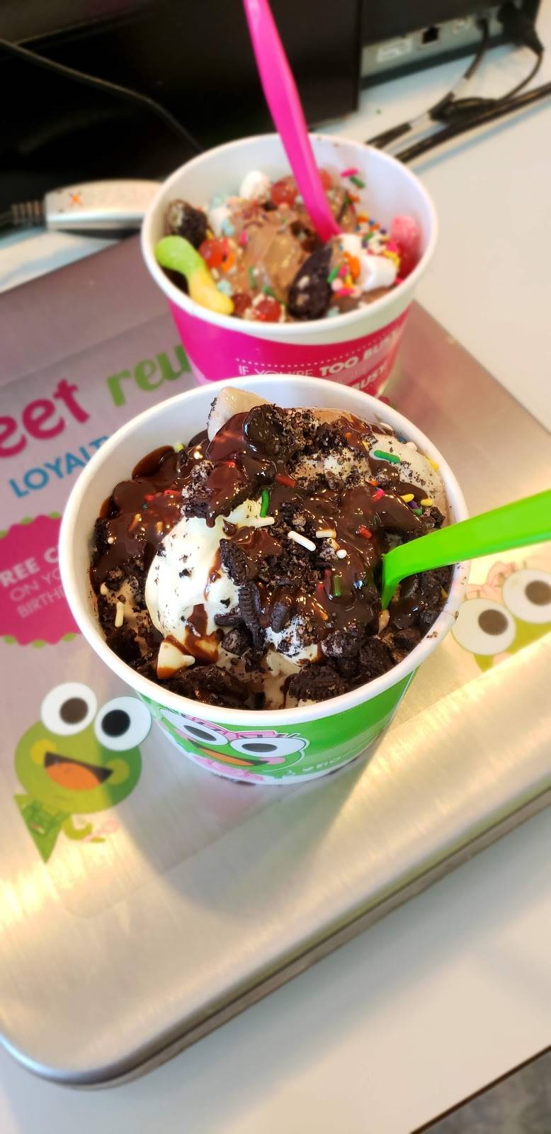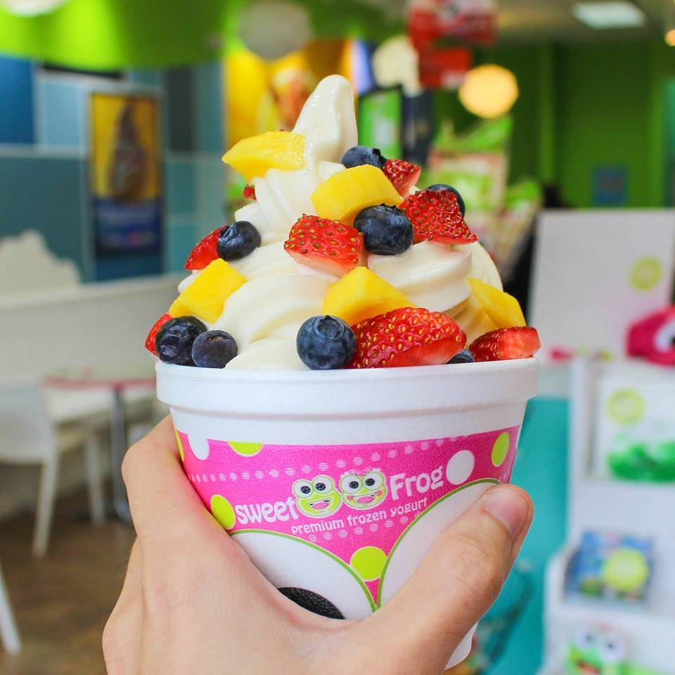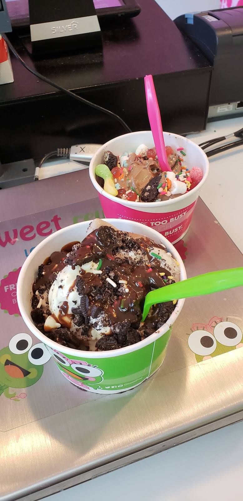 love sweet frog, this is a fine location. there's always atleast one machine not in order but that doesn't bother me. great fresh toppings. consistently there is one of the two regular weekend employees that is always rude. I don't get it. you're supposed to be happy and pleasant when you work at places like this. one woman has darker hair and shes awesome, there's another young lady who looks like she's being tortured having to be there. I'll go to another one that's closer to me.