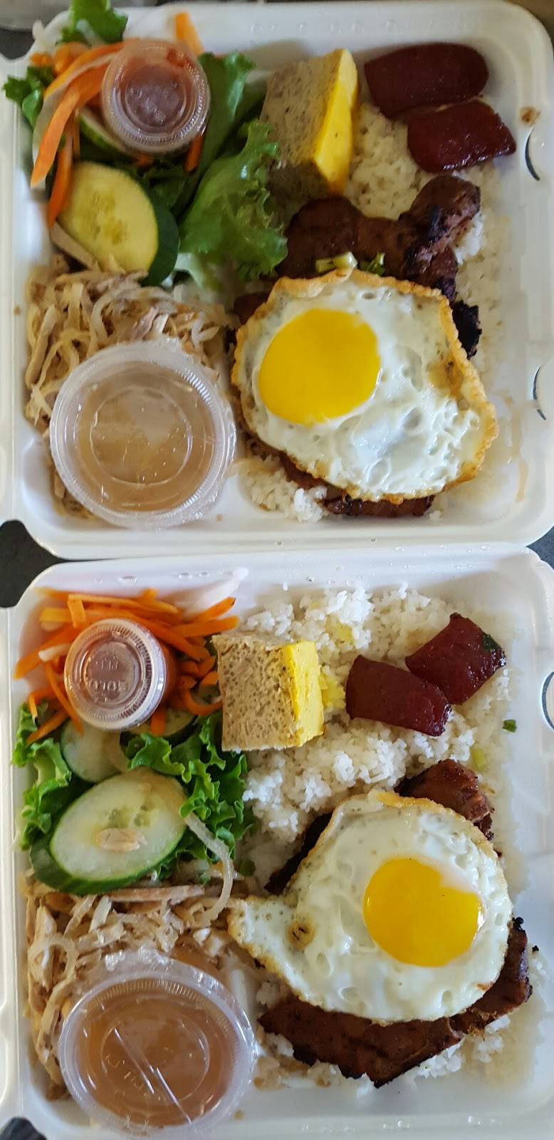It helps to speak Vietnamese, but you can get by with pointing out what you want. The restaurant has a small dry erase board with their specialties. Since "rice" is in their name, you can't go wrong with ordering "Com Tam Saigon", which is listed as #1. The dish includes broken jasmine rice (com tam), shredded pork (bi), grilled marinated pork chop (thit nuong), steamed pork quiche (cha), a fried egg, and Chinese sausage (lap suong). The dish is a generous size and comes with a small bowl of broth with cilantro to enjoy after your meal. It was truly delicious and the pork was tender and had a bit of char. Use the fish sauce (nuoc mam) and mix it into your rice and bi. There are condiments to doctor the fish sauce to your preferred level of heat.