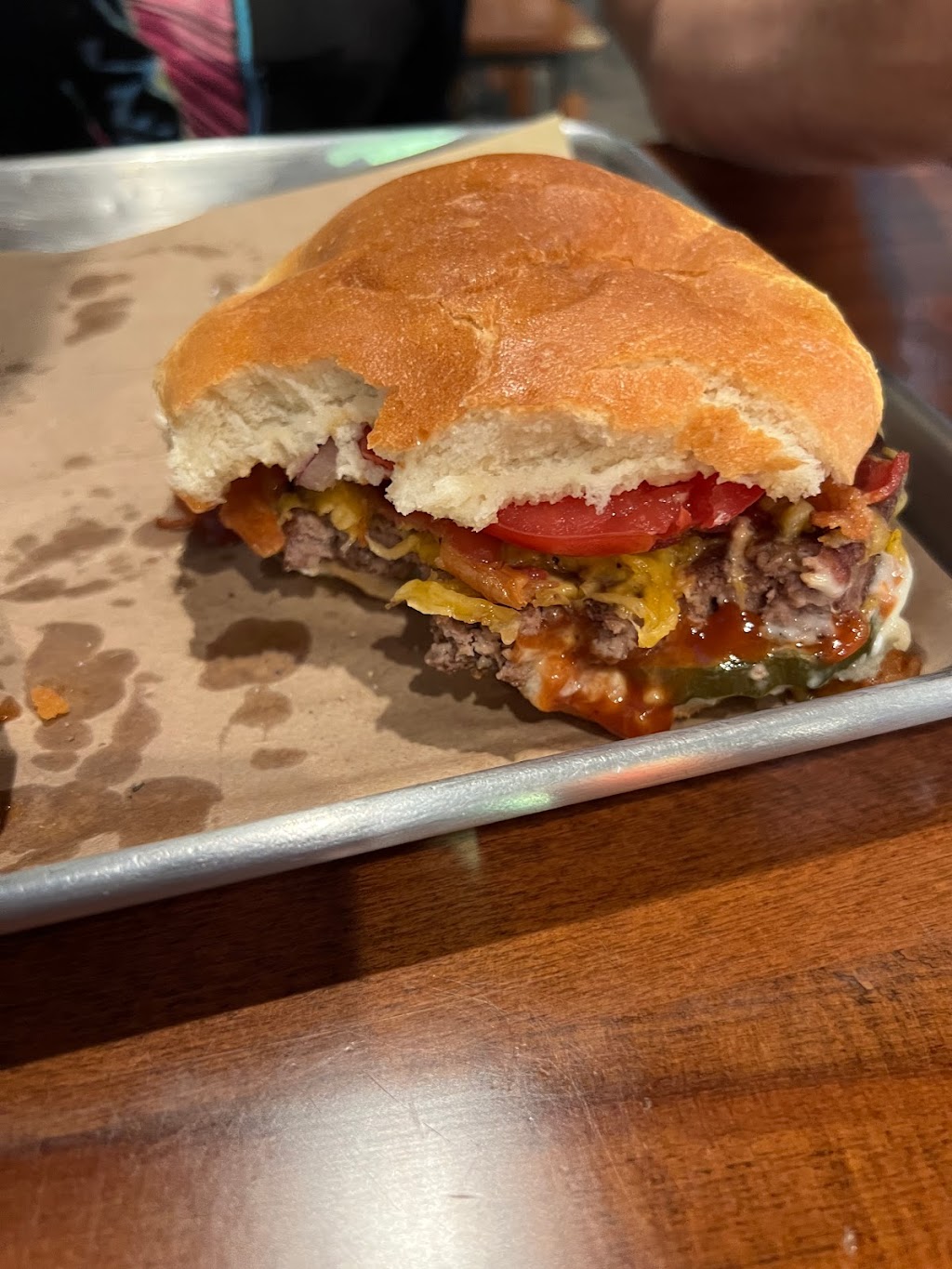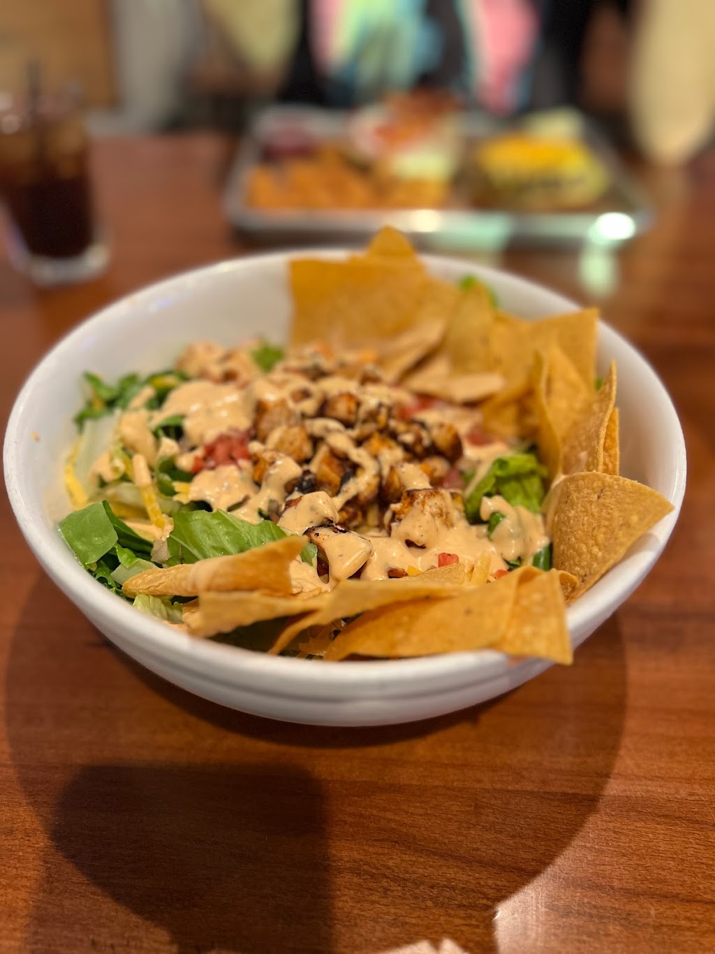 The atmosphere is great! They have some really awesome sports memorabilia and it’s also for sale. I had the taco salad with chicken and besides the fact that it was huge it was absolutely delicious. It’s one of the best salads I’ve ever eaten. The husband had a bacon cheeseburger and tots and he couldn’t even finish the burger. I stole a bite because the bun looked so fresh and it was!