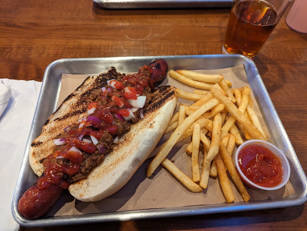 We have been here about four times since they opened in the spring. Service is excellent, and we've had to wait a few minutes to be seated twice. We've had the same server the last two visits, and she has been attentive and friendly. I've enjoyed a burger, chicken wings, the steak sandwich, and most recently, the Big Daddy 1/2-lb hot dog. Photos include the Big Daddy, the steak sandwich, and a chicken Caesar wrap.