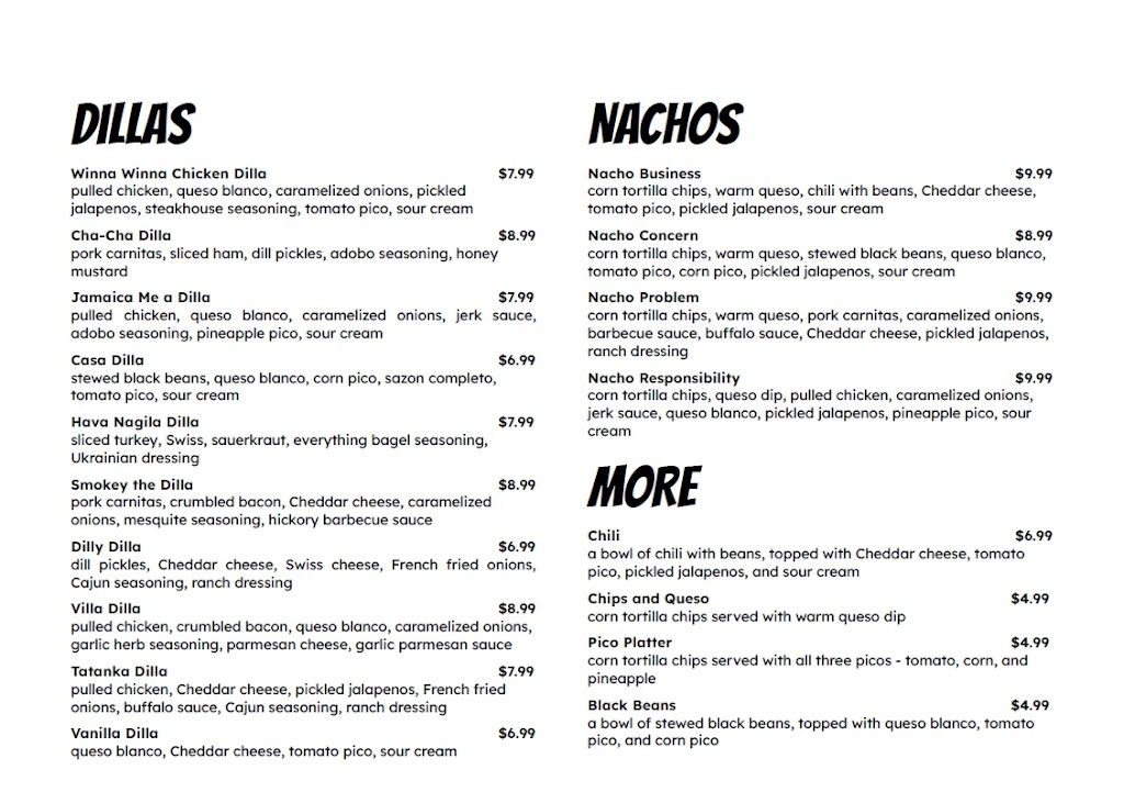 This may be the best quesadilla I’ve ever had in my entire life. I’m a HUGE pickle fan and the “Dilly Dilla” was fantastic. The owners are incredibly friendly and hospitable. We will DEFINITELY be back!