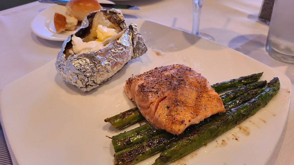 I had the salmon with a baked potato and mixed vegetables. The sauce on the salmon had a unique tangy flavor. The mixed vegetables were seasoned beautifully.