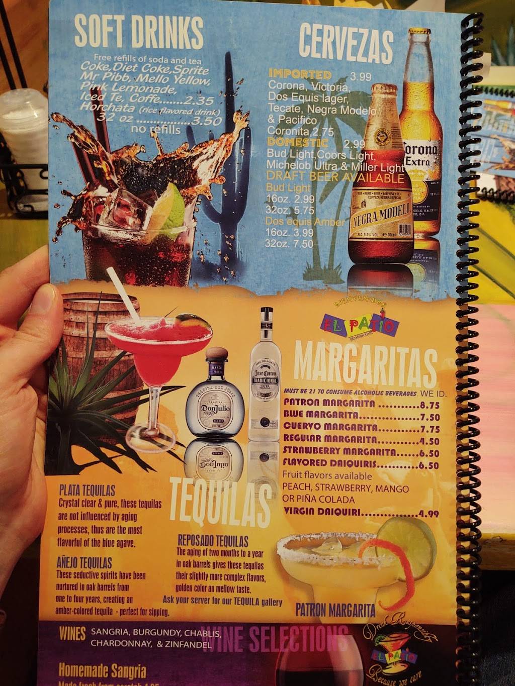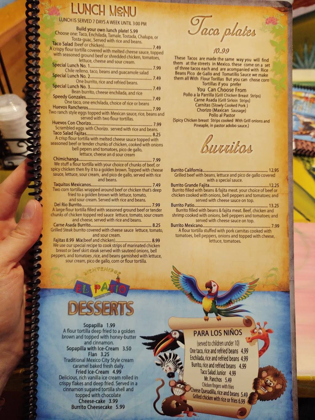 El Patio has acceptable food at a reasonable price in a fun themed setting. The moment you walk into the restaurant you feel uplifted and relaxed. The bold and brightly painted walls mixed with the decor and façade building roofs and walls make you feel like you are in a village plaza. The food is good except for the ground beef which isn’t so much ground as minced. It’s like a paste. I would recommend the chicken as an addition to your burritos instead. The restaurant has paraplegic parking, a wheelchair friendly entrance, and public bathrooms.