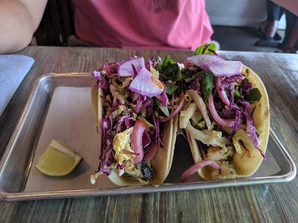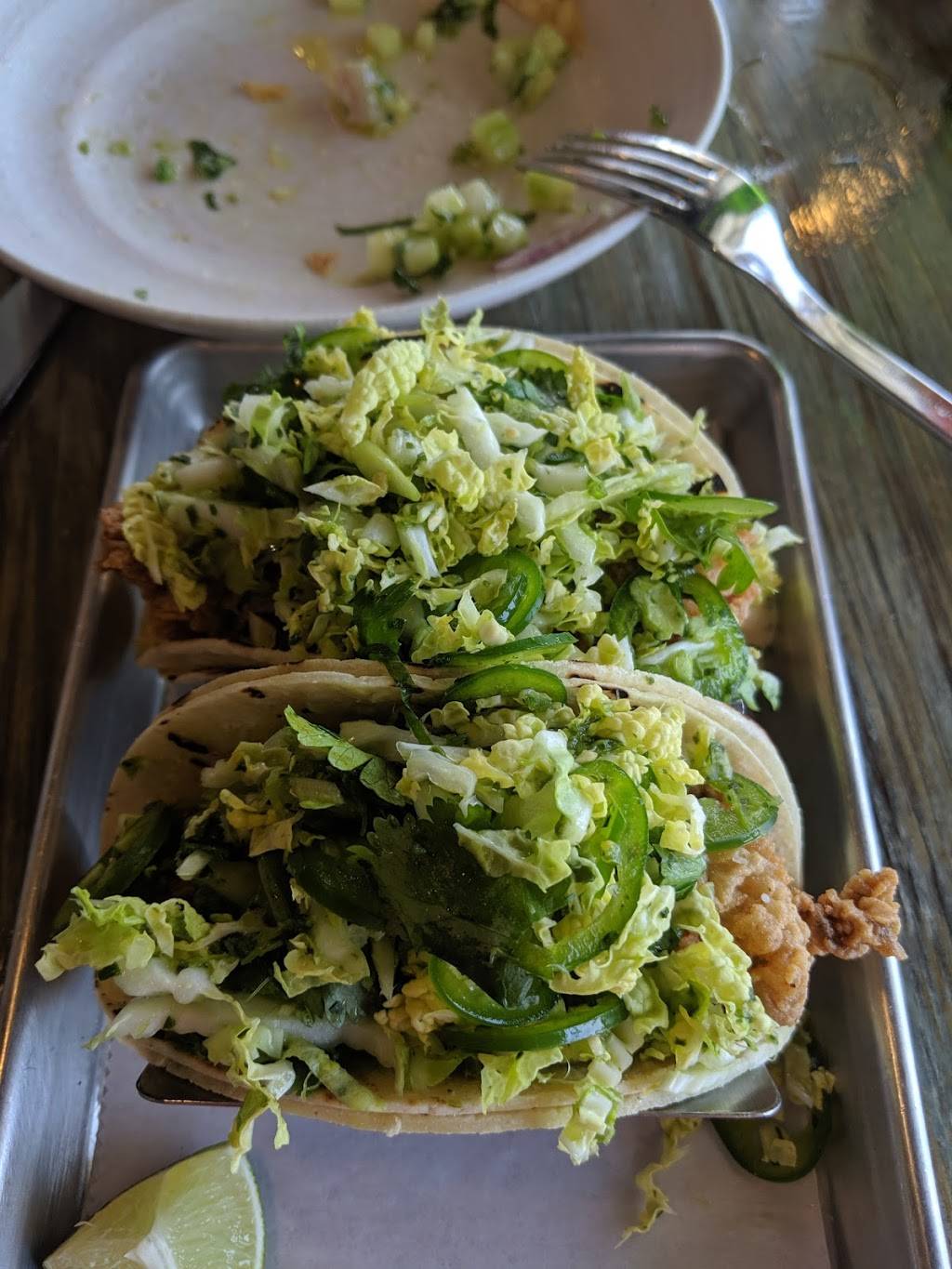 The tacos here we're probably the best I've ever had. The oyster poboy taco was fantastic. The ingredients were fresh. The only problem I have is that the drink prices are outrageous. I absolutely love to have a drink whenever I have a meal. I ordered the margarita and my husband ordered a beer. The margarita was very good, however it came in a small glass within enormous ice cube in it. When I lifted the ice cube out of it there was less than 2 oz of margarita in the cup. That margarita was priced at $11. I will definitely go back for the food. However I will not get a drink there anymore. I do not mind paying $11 for a margarita, but it needs to be more than two ounces. But going back to the food... delicious!
