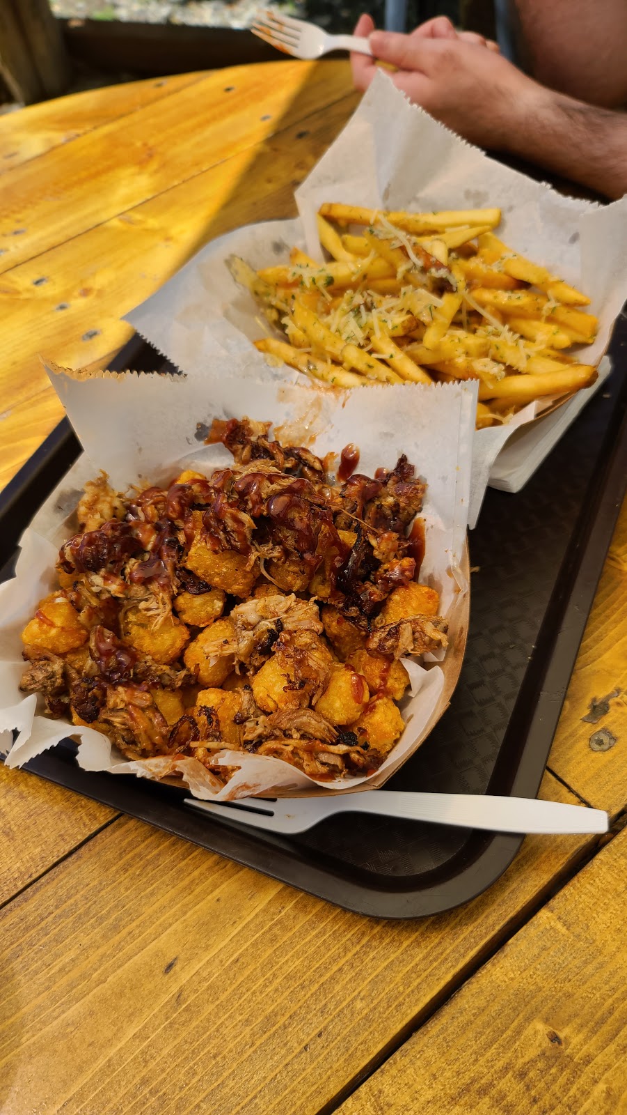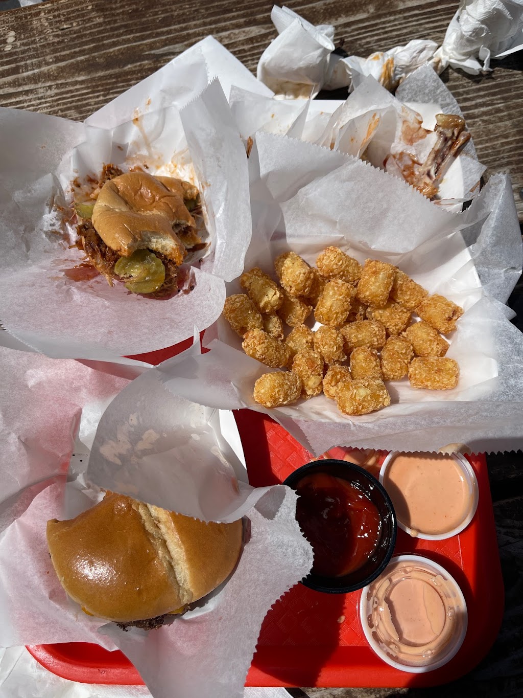 Great yummy food. Perfect food for a brewery. They had a solid burger menu and also had some veggie options (off the menu, you need to ask). We visited a brewery that Honey Hole was at. We had a great time having some beers (from the brewery) and grabbing a bite from Honey Hole on a nice sunny day. The staff was friendly and helpful. I'd definitely hit these guys up again. Good tots.