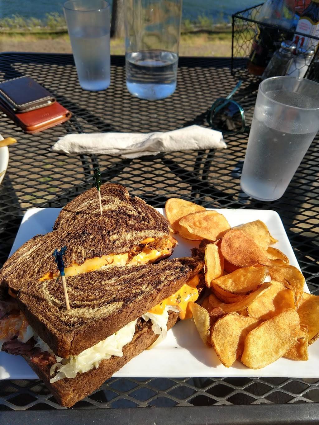 We both had coffee. And, the water was served in a lg bottle with a unique opener on it. This place is a zoo on the wkend. What a view, great place to eat out doors in the summer. They have beer, wine also.