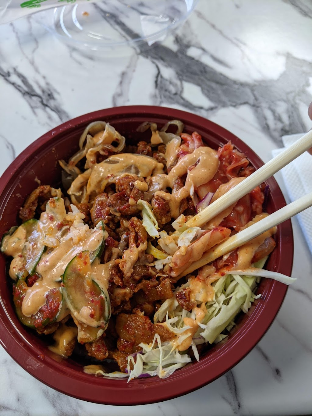 Food was awesome and prices were good. Bulgogi bowl was great and we split one between 2 people with all the toppings, $13. We also got an order of the rice cakes $2.50 and Seoul Chicken $13 with fries. They made the chicken fresh while we ate the bowl. The fried chicken was super crispy and seasoned well. Fries were good and tasted like potatoes (as opposed to just salty oil). Recommend all around.