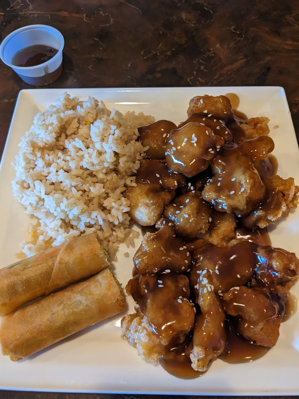 Server was extremely nice. The Egg Rolls and Fried Dumplings were super delicious, made just right. But the sweet and sour chicken didn't have the right flavor profile. It was sweet with no tang to it, became almost too sweet the more I ate it, and the fried rice didn't have any veggies or egg stir fried in.
