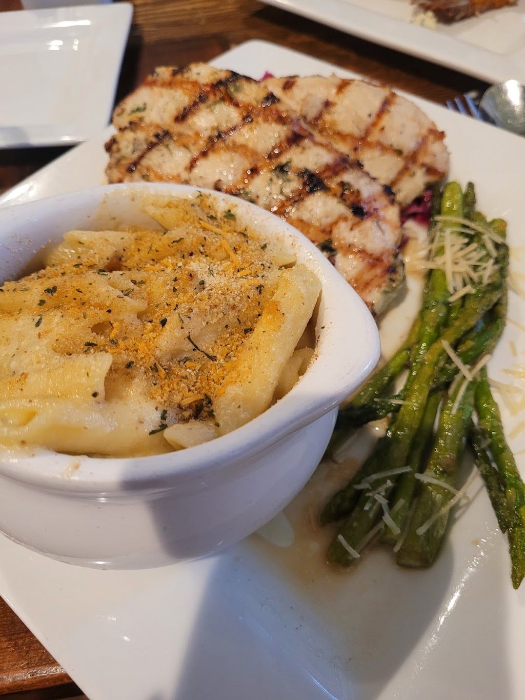 For entrees, my friend went with her favorite, Chilean Sea Bass. It was served with thin asparagus spears (which she and I both prefer) and potato croquettes, which tasted a lot like a loaded baked potato in small pancake shapes. As for the Sea Bass, she said she liked the way it was grilled and the seasoning on the outside was good. The actual fish was a little mushy. This is her go-to at a lot of places, so I trust her opinion on the fish.