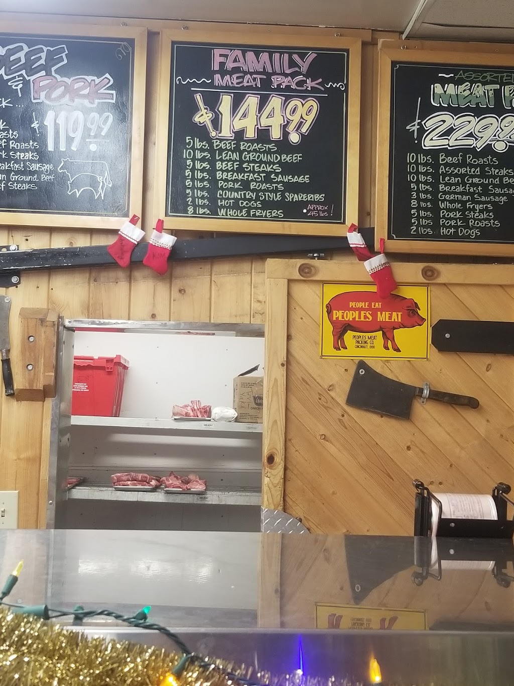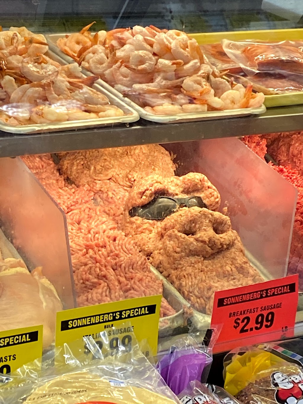 They have seafood, steaks, Burger, pork, several different sausages, meat sticks, oh, and bacon! Good bacon! Plus there is plenty more. The deli has potato salad, pasta salad, cheese, and lunch meat too.