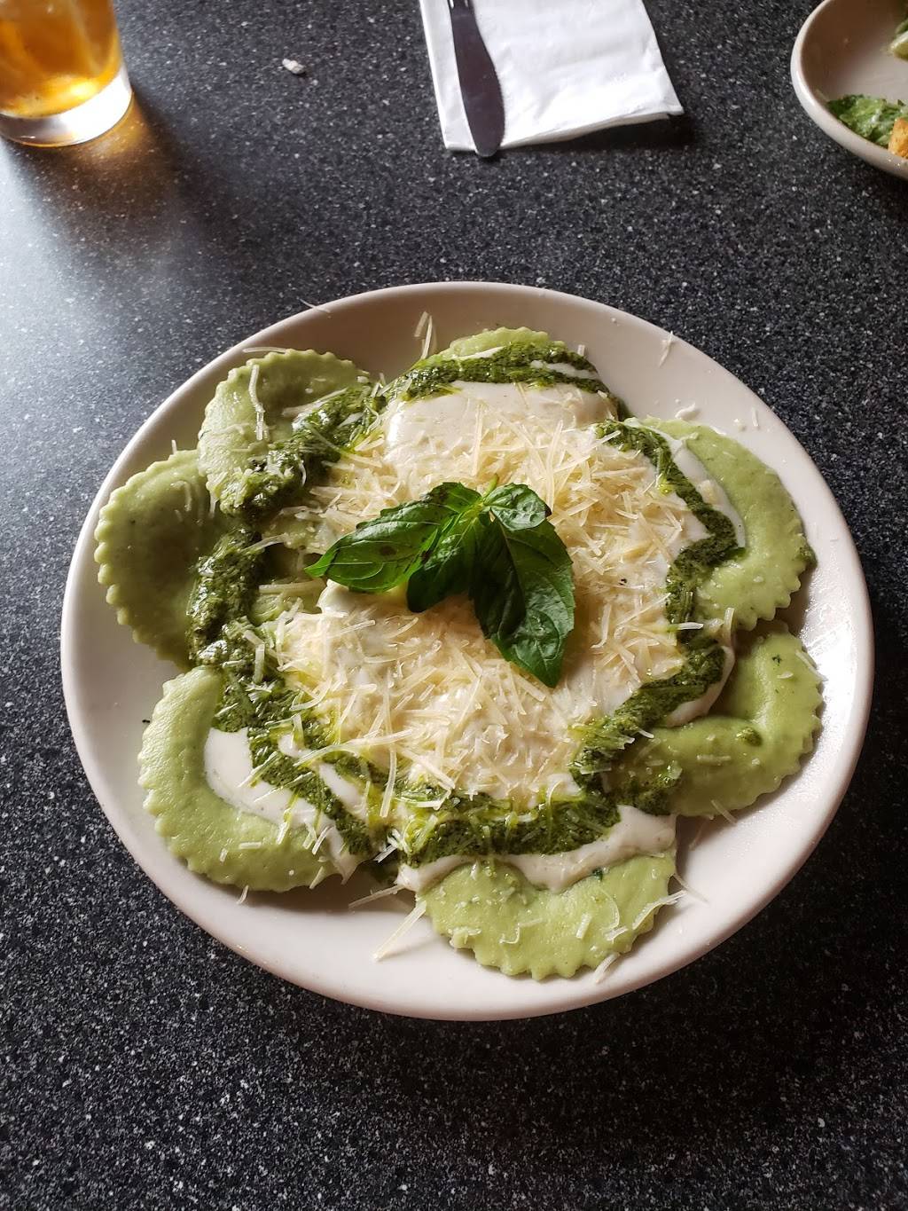 This place is fantastic. The prices aren't too high, the food is very high quality, and the service is lovely. There are three different areas for seating; a sunroom sort of area, a main area, and a small section with some games for the kids. The bathrooms are okay, there is a separate handicap bathroom. If you have a group of four or three, you shouldn't go for the booths though, because they're more of for two people. I got a the spinach raviolis with basil pesto and cheese and cream sauce. I highly recommend this restaurant. The only downside is that my mom keeps mumbling "so good." I think you broke my mother please help :)