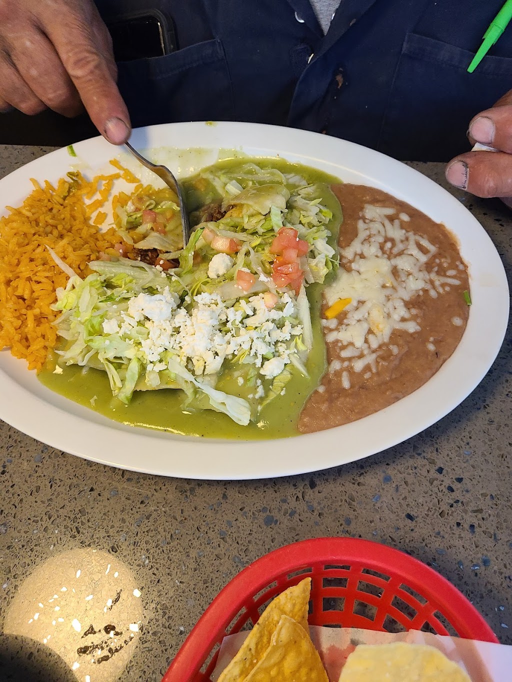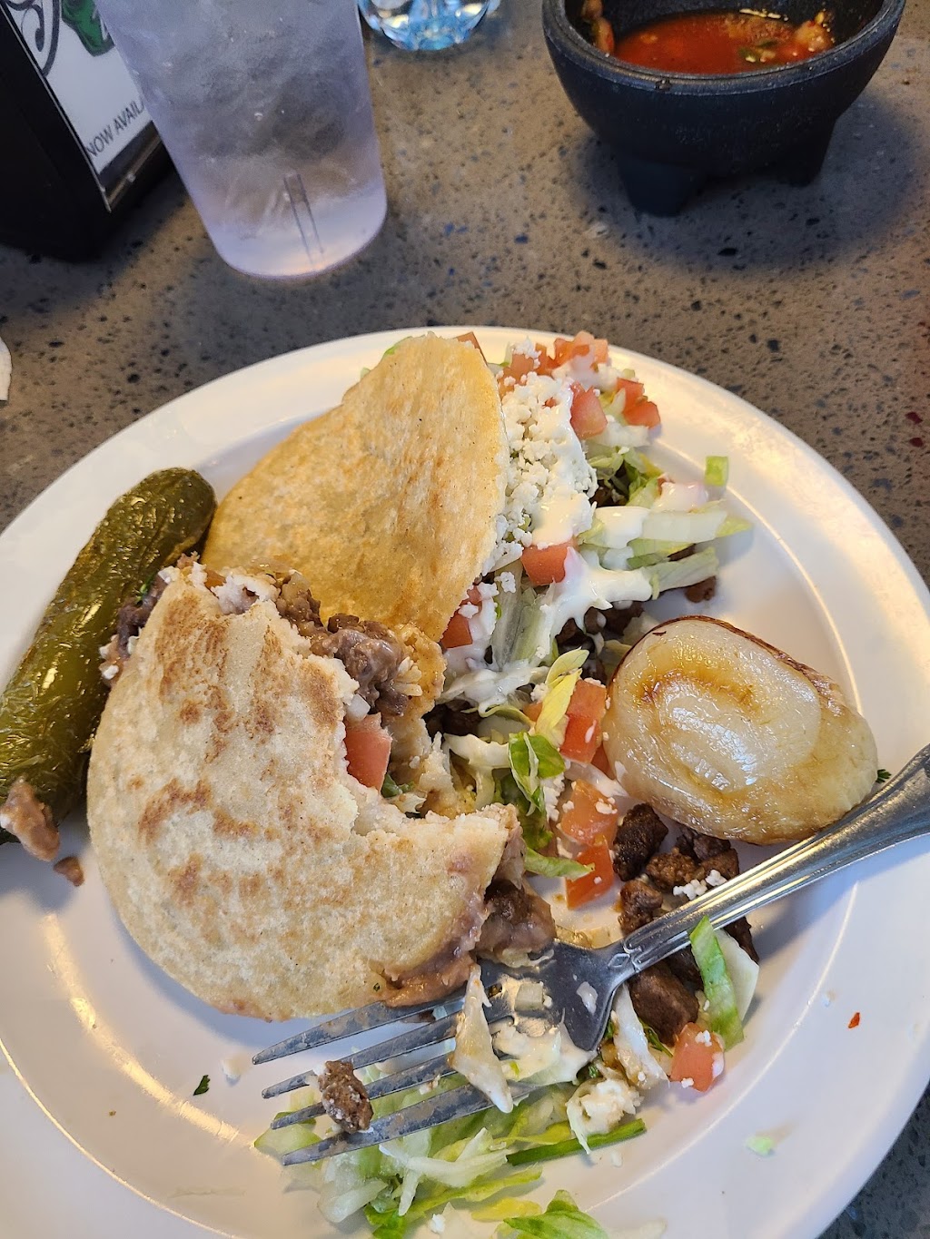 I had the gorritas and they are stuffed with beans, cheese, Lettuce and tomatoes, Chile and grilled onion on the side ,and my choice of meat ,lengua (tongue) or it can your choice of meat and my honey had enchiladas with green sauce with barbaco, beans and rice ,salad