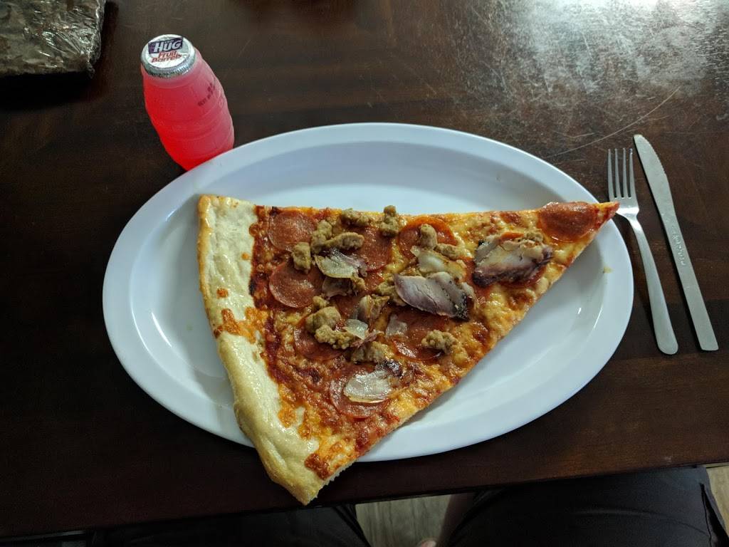 Huge pizza. We got a slice for each of us. We left happy and full. One slice is $5 and $1 per topping. A full pizza is so huge it would've taken days to eat. The pizza is thin, crunchy, crispy crust. Tasted very good. Service was quick and courteous. Locally owned and operated. Thumbs up recommendation.