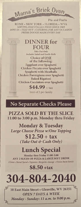 Very clean, nice folks. Thought the prices were a bit up there but when we got our order we were pleasantly surprised how much there was. Had to get a take out for our calzones which will last for a couple more meals. We will definitely be back. The sauce is great. We left a generous tip.