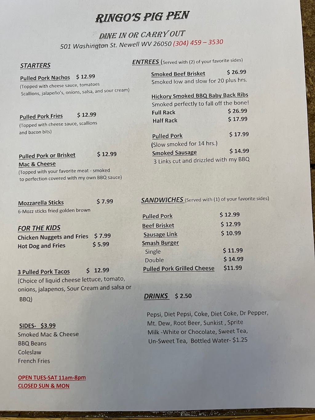 Today my husband and I tried Ringo's Pig Pen for the first time! I had the pulled pork mac-n-cheese and he had the full rack of ribs. The ribs didnt make the photo session 🤣. To say that it was wonderful would be an understatement! The BBQ sauce seemed to be more of a sweet vinegar base which is usually something my stomach doesn't agree with. However, my belly doesn't seem to be angry at all! Lol. Not only was the food delicious, the owner came out to introduce himself and gave us a little back story to the business and what his expectations were for the future concerning the town of Newell. What a bright future Newell WV has with this hidden gem!