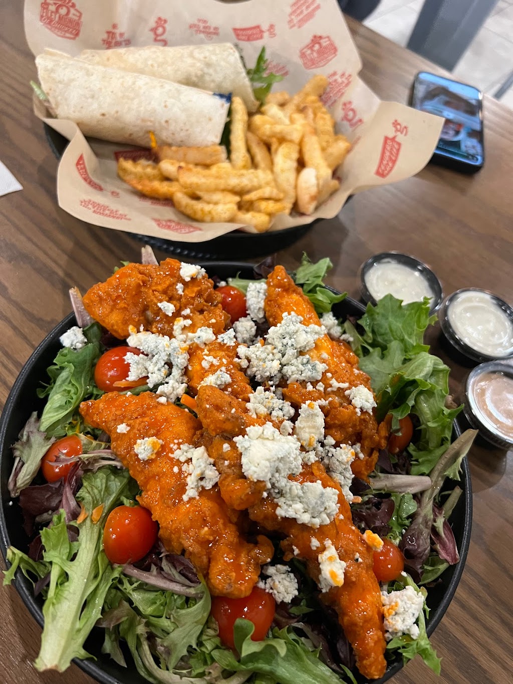 Good chicken tenders. Large salad with too much weeds for me - more variety of greens and more of the other salad items like carrots and tomatoes would be better. Generous amount of real blue cheese crumbles. Reasonably priced. Nice staff person on register obviously a trainee. Could not get my order right. I wanted two breaded and sauced pieces at $2.04 each and got a kids meal instead. Check your order before you pay.