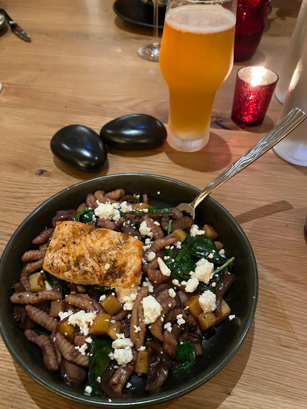 White corn cavatelli with salmon and draft Spotted Cow made for a great dinner. Great cleanliness and socially distanced seating (April, 2021).