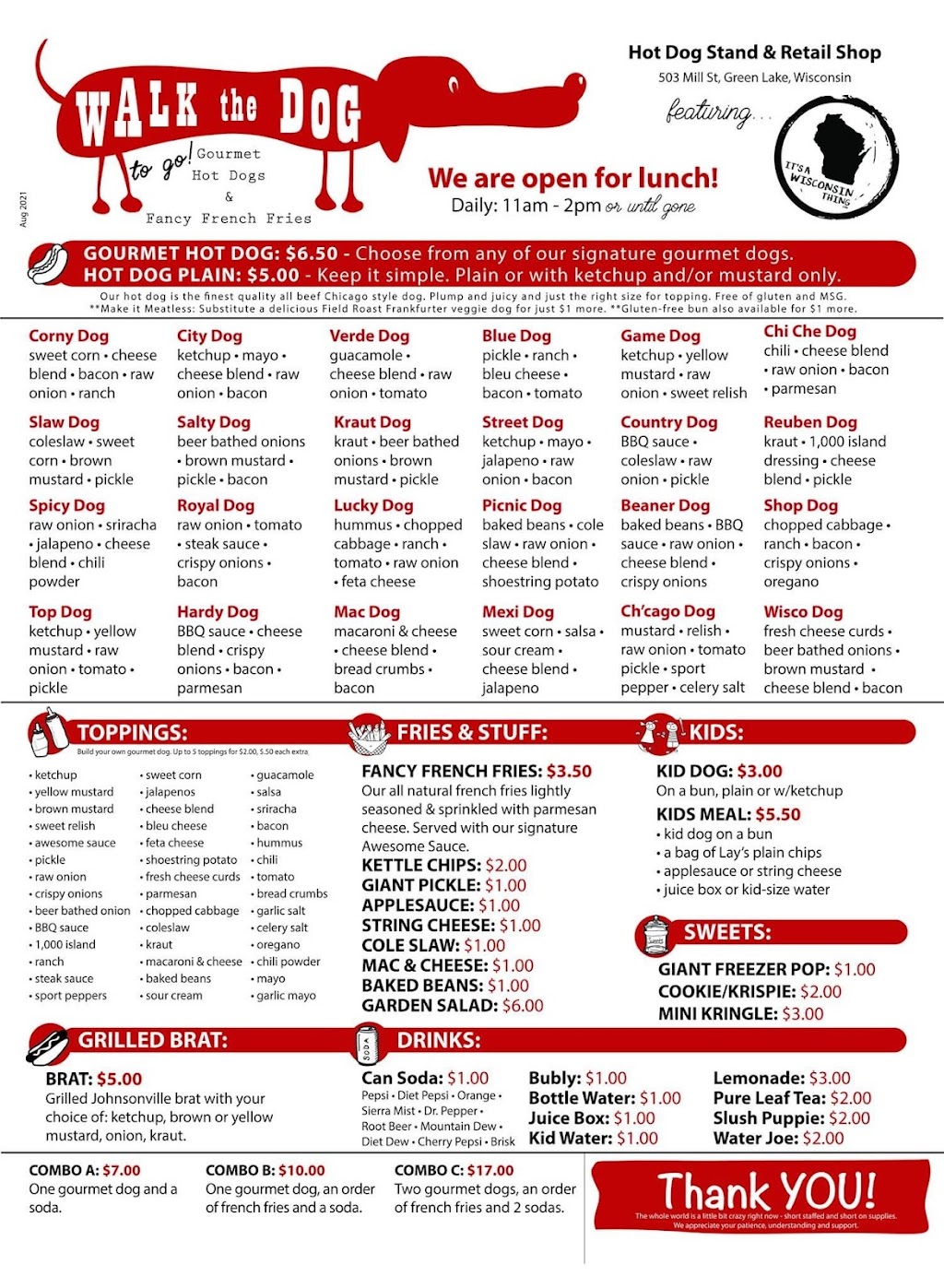 Great place hidden in Green Lake! The gourmet hot dogs are delicious! So many choices and creative ideas! Kids meals were fun! The staff is friendly and chat about the options and the town! We enjoyed our visit and we will be back! The French fries are amazingly good! 🍟🌭❤️
