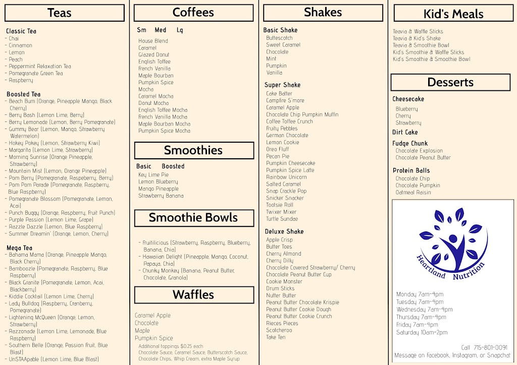 Heartland is a wonderful place to get a nutritionist meal, snacks, iced coffee, smoothies, waffles, prolessa shots teas, the ladies are always smiling, it's also a place I do my business through.