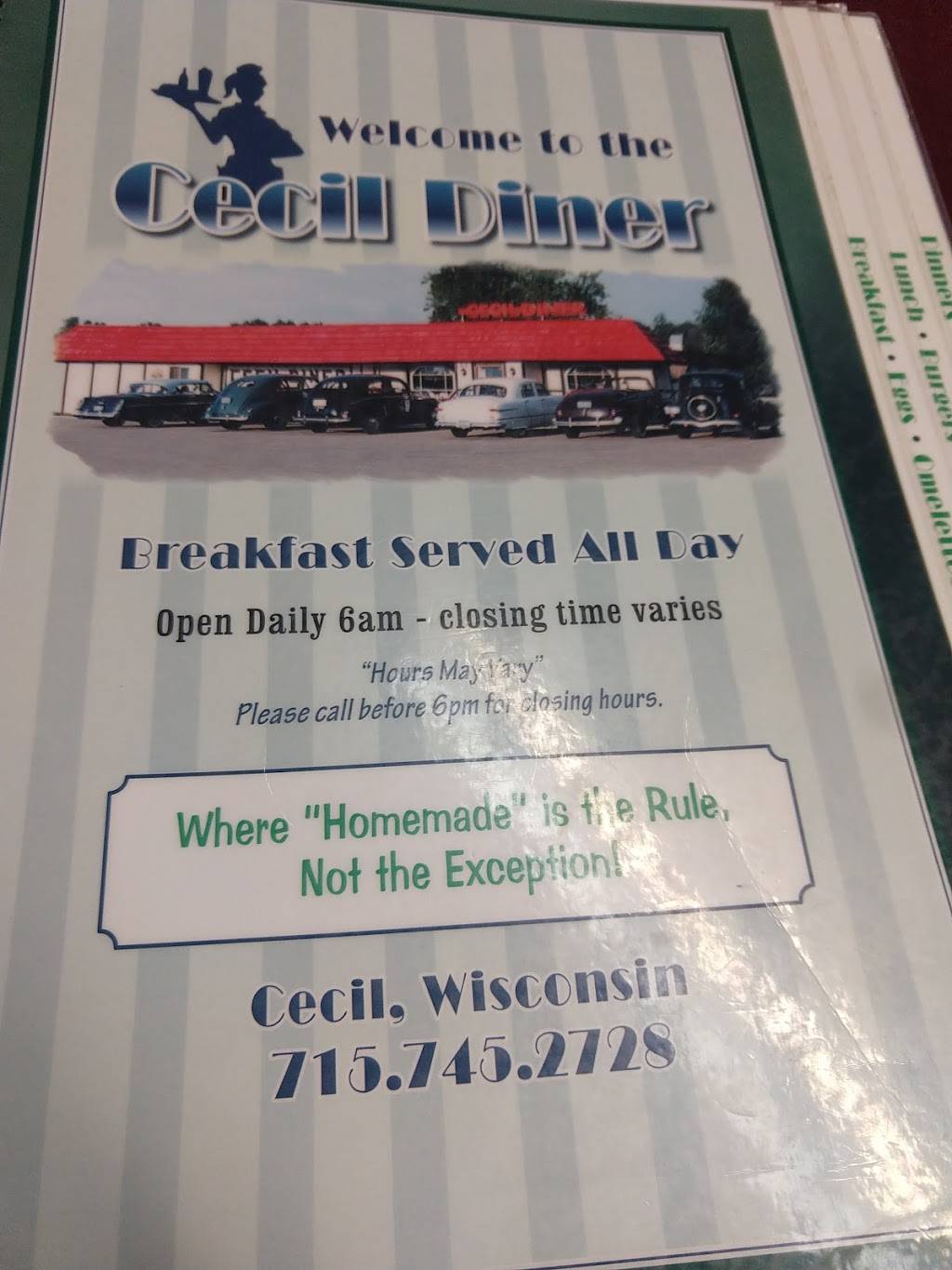 This place is just a great old diner in cecil WI ON hwy 22 great food and service been going there for 25 years+.