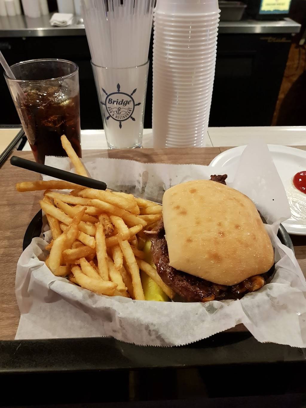 My wife and I were in Fremont, we asked for recommendations for dinner on a Monday night, when most restaurants in the area are closed for the season or just not open on Mondays. The first place mentioned was the Bridge Bar and Restaurant. We were told the food was good, well I must disagree, the food was exceptional. Due to the heavy rainstorm I got the food "to go". The place was almost empty when I got there around 5:00 pm. The bartender was friendly and very helpful in my food selections. My wife had ordered the fish sandwich with sweet potato fries. I ordered coconut shrimp appetizer, Wisconsin Chili with raw onions, sour cream and cheddar cheese, then I asked the bartender if I should order the Bridge Special burger (1/2 # burger done the way you like it, or should I try the Burger Of The Month, which was a 1/3# burger with sauteed onions, sweet pickle chips, lettuce and tomato on a pretzel bun with sweet potato fries. As I was waiting for my order, I realized I forgot to pick up ice, I asked if they sold ice, the first response was not at this time of year, then she went to talk to the cook, he showed her where to get the bags and to fill it for me. This saved me an extra trip to the gas station. We enjoyed all of our food and saved the leftovers for tomorrow. Great food with even better people, we will definitely be back. GOOD JOB.